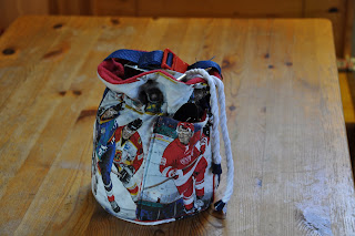 Stephen picked out NHL fabric and I went to great lenghts to cut the fabric so that whole hockey players could be seen on the bag. Rather than a purse strap, I made a short buckled strap (the buckles are the same as would be found on a backpack) and the idea is to strap it to your backpack somewhere. He used this bag once and then unfortunately somebody at school made a comment about it being baby-ish and that was THAT!)