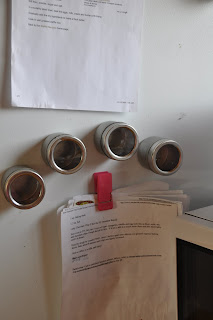 Notice the small metal container in the middle of this photo. We looked for a non-plastic container to put nuts, yogurt and dips in and finally settled on the magnetic spice containers that are readily available at most grocery/kitchen stores. It does have a small see through plastic top and yogurt and dips can get a bit messy if the entire tiffin is swung around or carried upside down. The magnetic bottom does not stick to the tiffin but does stick to our fridge, making instant storage for unused containers!