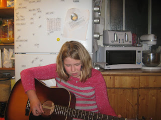 The kids decided not to take strings this year in school. We are somewhat relieved about this as the rentals were costly (about $600-700 for the cello and violin) and we didn’t really feel they made a lot of progress in the instruments compared to their piano instruction. Katie, who had the option of taking band this year, opted to take Fine Arts because of the Drama component. Her desire to learn the guitar hounded me all summer and last night I agreed to dig out my guitar and teach her to play. We both think that piano gives them a really broad based musical foundation that they can take with them and learn any instrument…we still have a flute in the house (mine, which I still play occasionally), and although I hesitate to mention it so where they can read it, I think my brother Tom’s trombone is still at Dad and Gail’s!!