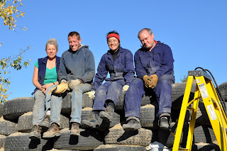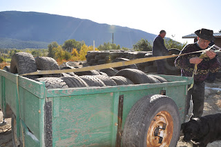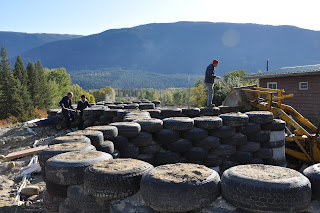 Today Tom, Steph, Chris and I filled and packed 27 tires. This leaves thirteen tires to be packed tomorrow. Unfortunately we won’t have their help tomorrow (they are busy getting ready to make a big turkey dinner for 19 people at their cabin near Bridge Lake, B.C.) but thirteen tires shouldn’t take us more than a few hours.
