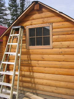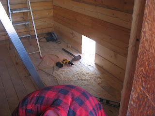 Cutting out the window opening. Much easier to allow for a window when the building is going up. Such is the life of retrofitting. Chris is using our small electric chainsaw. Although we don’t use chainsaws very much on our machined log buildings, we have always had a good gas chainsaw. In 2003 when the wildfires came through our valley we purchased the electric one to minimize the danger of fires from the gas machine. The electric chainsaw is a bit more responsive in small places.
