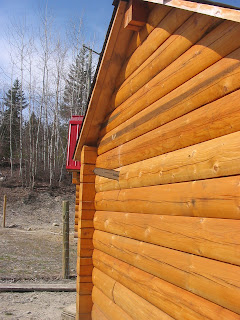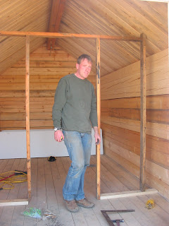 For the last several days all of us have been working on it. We moved it into place next to our sheep barn and Chris and Stephen framed one wall. We are going to have an entrance area with shelves. This wall will be insulated and we have sided the outer side with #2 log siding that was laying around.